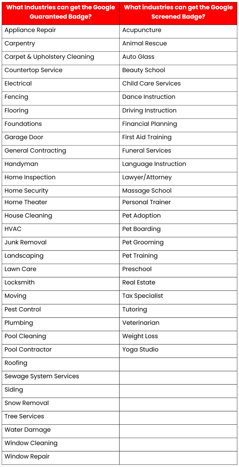 THE FOLLOWING INDUSTRIES/BUSINESSES ARE CURRENTLY ELIGIBLE FOR THE GOOGLE GUARANTEED OR GOOGLE SCREENED BADGE